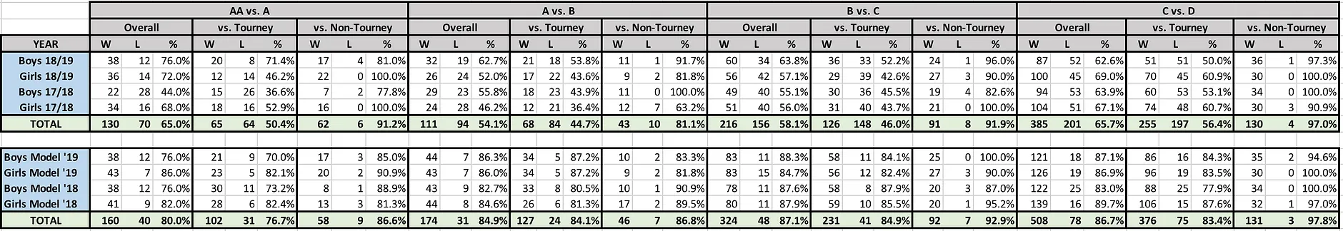You would also expect some separation when going to AA from A, since there's no cap on how big a school can be, and you get it a little. AA boys teams went 24-6 against A teams that missed the tournament, a far cry from those C vs. D numbers (although the AA girls did go 38-0). What little advantage the larger schools have pretty much disappears in classes A & B.