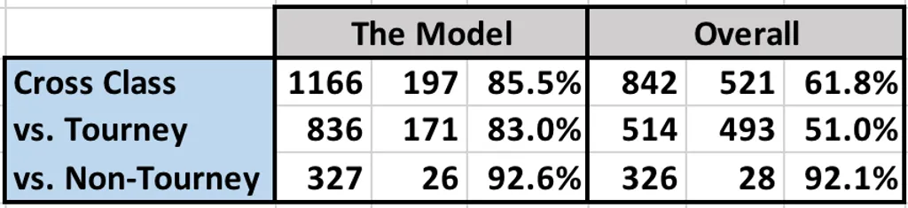 If enrollment isn't that important, what is? Being good at basketball. While higher class teams struggle mightily in cross-class games, good basketball teams do not. In cross-class games, the higher ranked team according to the model wins 85.5% of the time. That's essentially the same winning % as games between schools in the same class. In those tougher games involving tournament teams, the better team wins 83.0% of the time.
