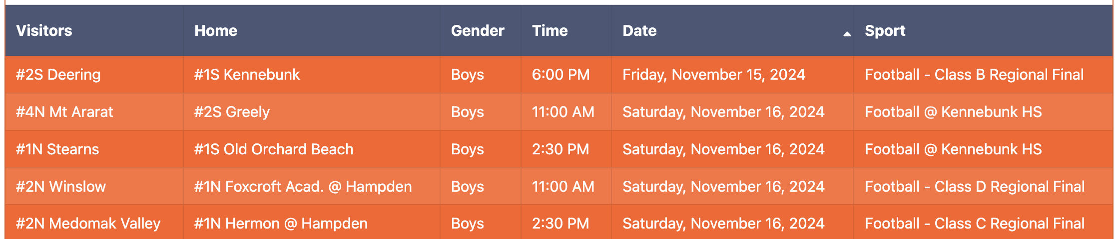 However, the Model seems to think Kennebunk and Deering could be the best of the bunch. Kennebunk won the regular season matchup 41-0. That was one of the bigger surprises of the season, but the Model wasn't thrilled with the Rams needing overtime to get by Marshwood last week and was impressed with Deering blanking Massabesic. It's worth noting the playoffs are worth twice as much as regular season games. It also, by design, doesn't care that Team A beat Team B, because that's not, by itself, a reliable indicator for the rematch. We'll see!
