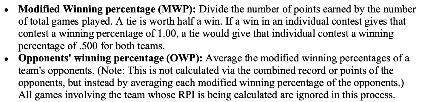 RPI = (0.60 × Modified Win Percentage) + (0.40 × Opponent Win Percentage)