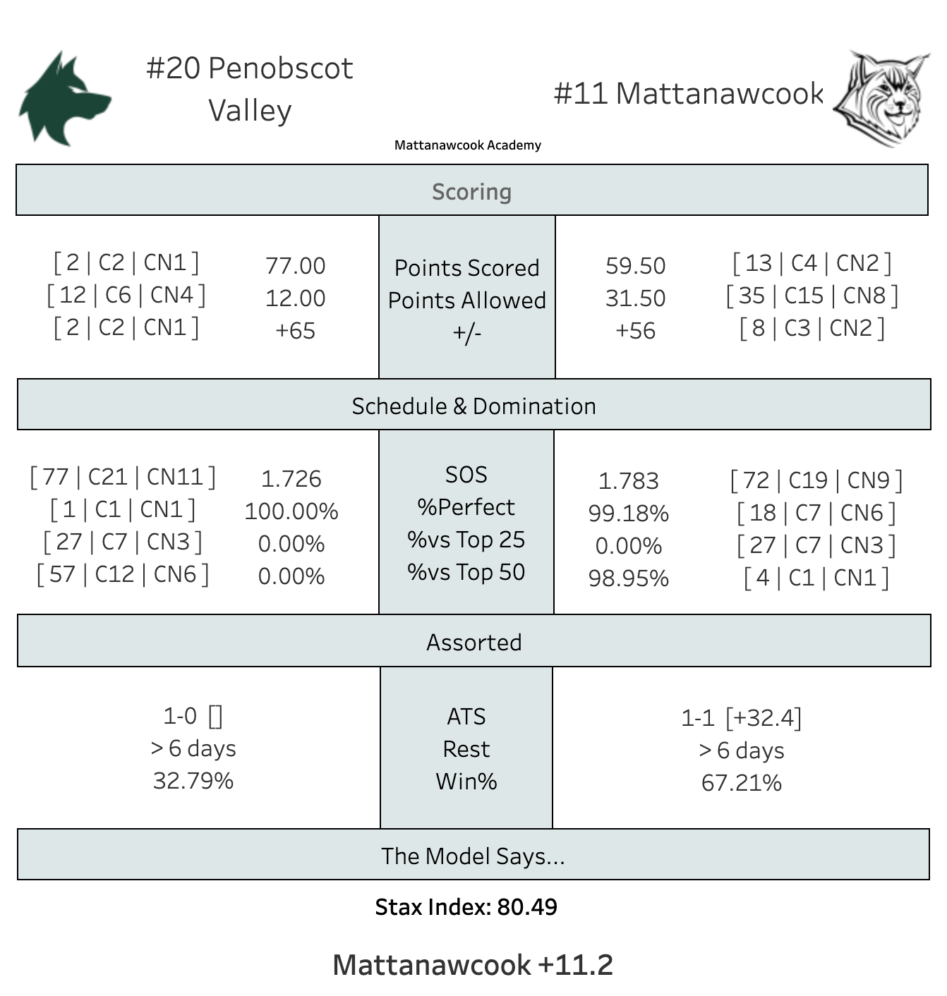 Mattanawcook has been on a roll early, winning handily against Central and Calais to move to the top of C North. They'll host Penobscot Valley. The Howlers absolutely destroyed Schenck in their season debut, 77-12. But, that's a Class D school ranked near the bottom of the state. This will be their first test of the year in what should end up being worth a lot of Heal Points to the winner.