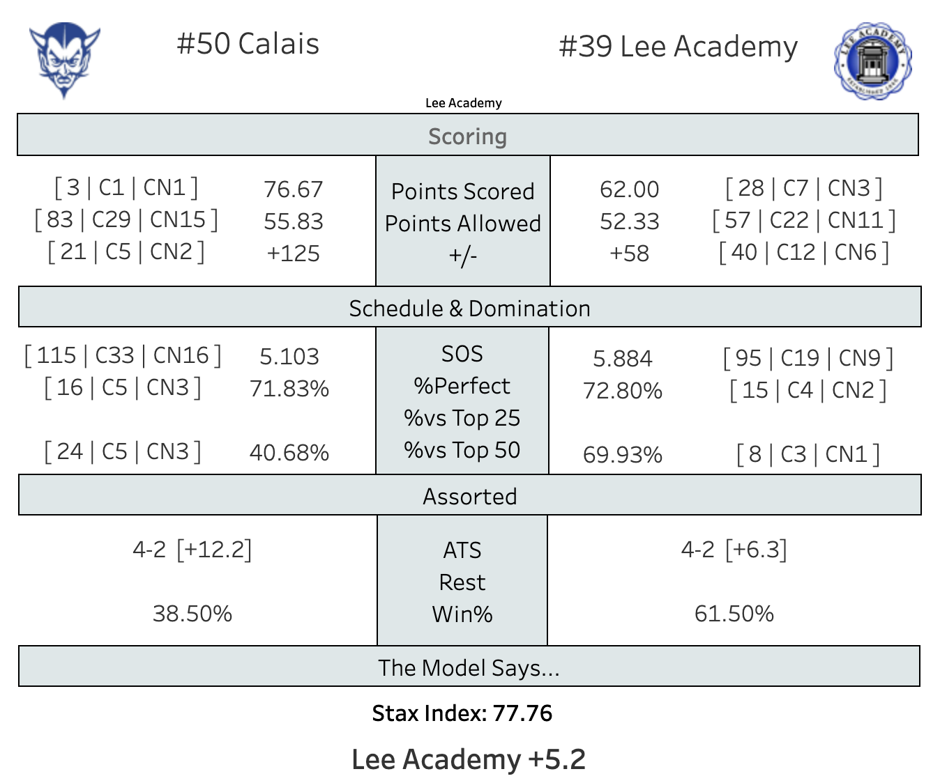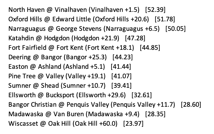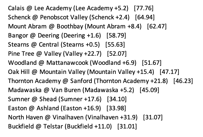 A couple of days ago, Lee Academy pulled off an upset on the road against Machias to move to 4-2. It also moved them to 3rd in C North, an essential spot in a region where the top 3 get a bye to Bangor. They now have a 63% chance at getting that bye, according to the Tournament Odds.