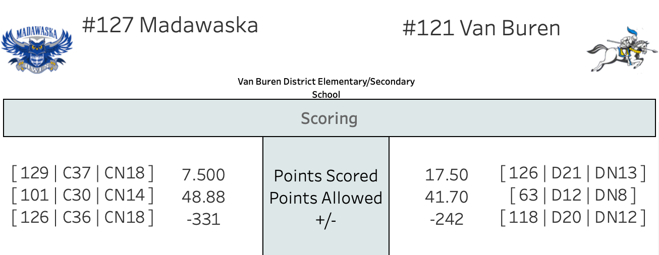 You would expect scoring to be at a premium. The Model's pick for this one was Van Buren by 4.2, which is a bold pick. 4 points is a LOT in a game with this little scoring.