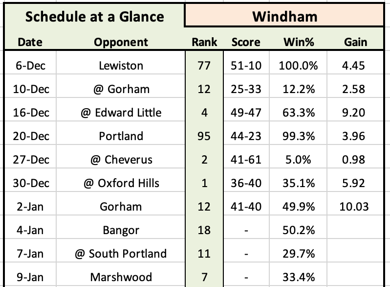 That's the 3rd hardest schedule in the state, behind Bonny Eagle and Oxford Hills, and they've held serve, only losing to #1 Oxford Hills by 4 on the road, beating #4 Edward Little on the road, and then knocking off #12 Gorham on Thursday. The schedule never really gets easy in AA, but it lets up a tiny bit. And then they've got to play Cheverus and Oxford Hills back-to-back again in late January.