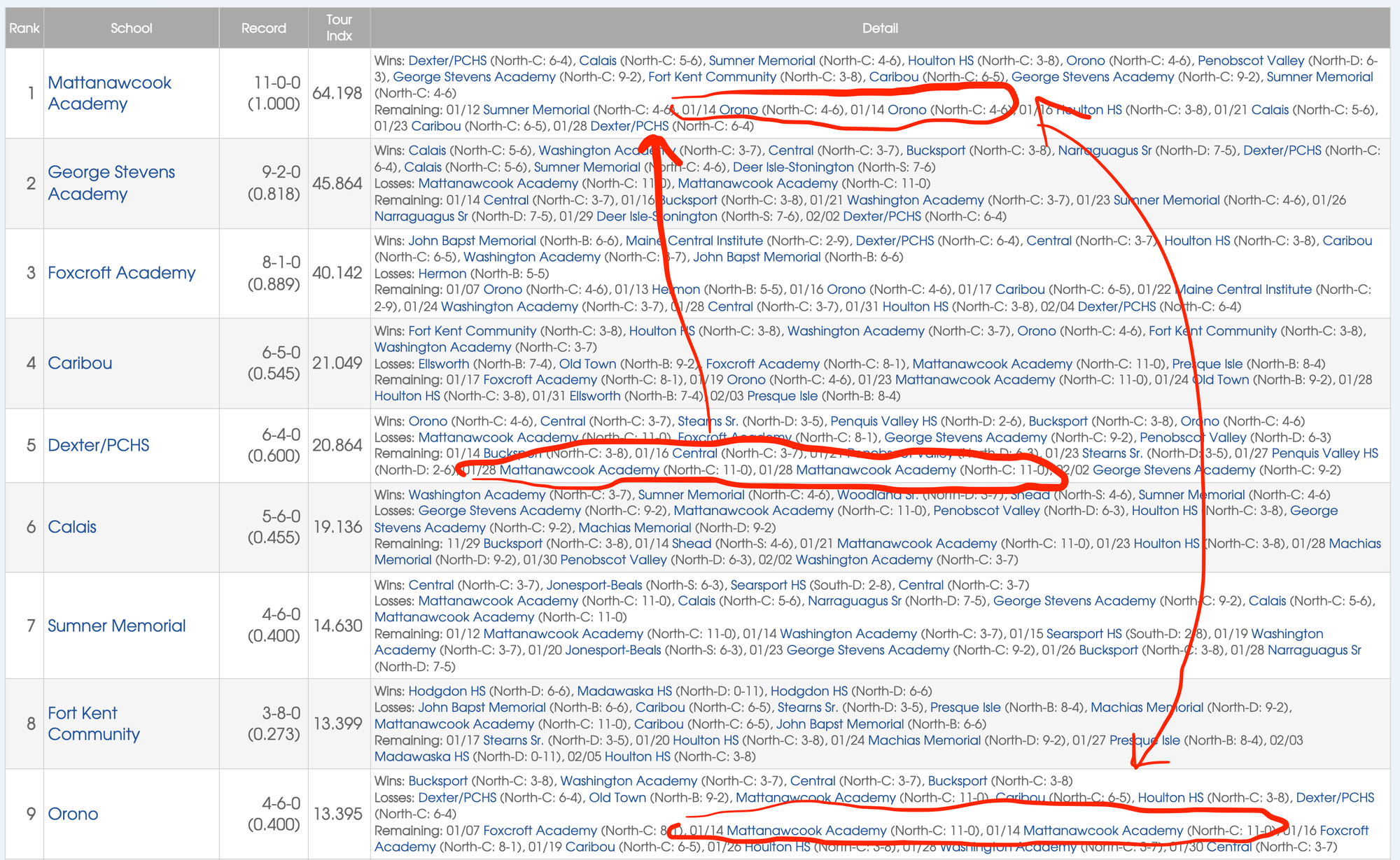 So the Mattanawcook girls are scheduled to play a double-header against Orono (not happening) and Dexter is scheduled to play a double-header against them, but Mattanawcook only plays them once. Also the Lynx are supposed to play Fort Kent on 1/31, but that game has vanished and that's just the first region I checked.