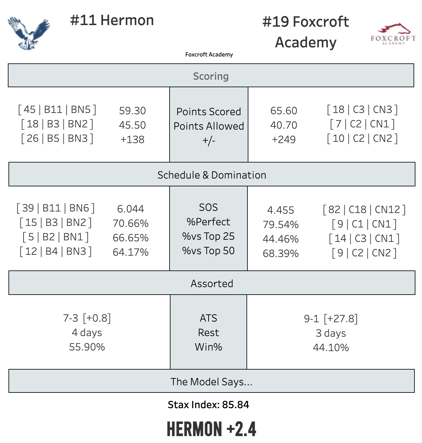 We don't have pace numbers, but this is also a contrast in styles. Foxcroft is one of the highest scoring teams in the state at 65.6 ppg. They lead Class C in %Perfect at 79.5% and are second in C in point differential at +249. What's weird, though, is they've played two teams inside the top 40: they beat #8 Caribou by 14, but lost to Hermon by 22 on Opening Night. Those two results don't really mesh. It feels like one of them is an outlier. The question is, which one?