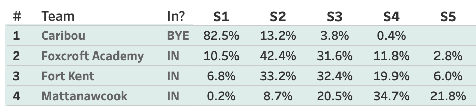 They'll head to Dover-Foxcroft to take on a team that's kind of in the same position. Much like Hermon, they could get the one, but they're most likely in the 2/3 range. They could also drop to 6 (actually, there's a handful of absolutely worst-case scenarios where they could fall all the way to 7).