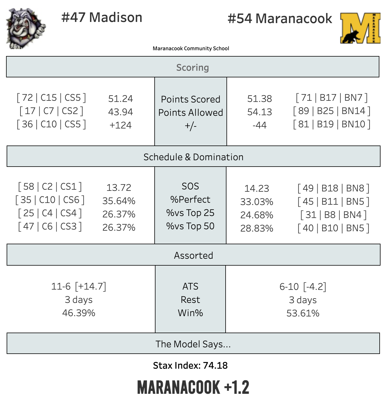 After starting 0-3, Madison righted the ship, winning 6 of 7. Since then, they've been alternating wins and losses and they're essentially in a coin flip with Winthrop for the 6 seed in C South. Their last game was a loss, so if they keep alternating, they're due for a win.
