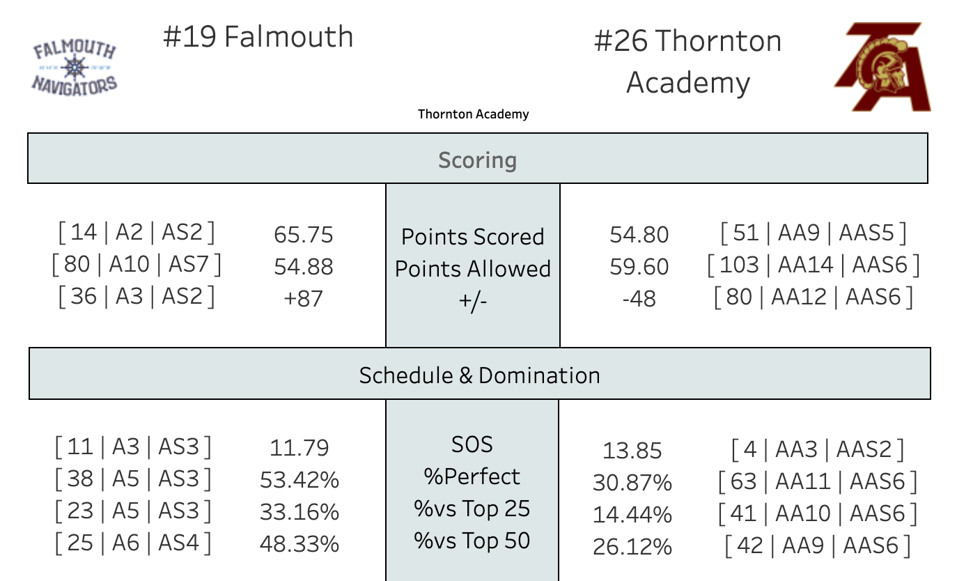 After starting the year 3-0, Thornton Academy has dropped 6 of their last 7 against a pretty rough schedule. 4 of those losses have come against teams in the top 10. They've played the 4th hardest schedule in the state so far.