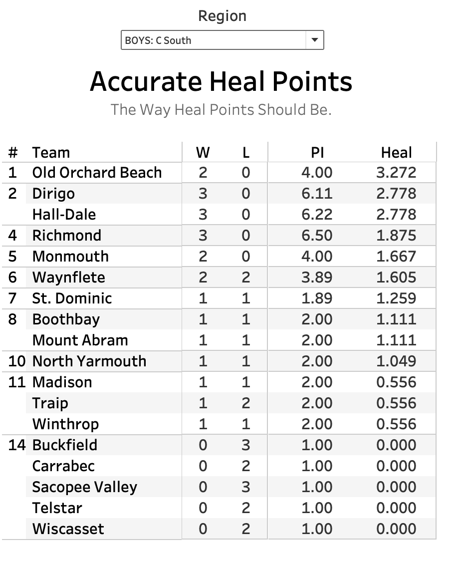 If you're wondering, the MPA has Boothbay in first. With a Varsity subscription you can get access to the real Heal Point standings for the entire state.