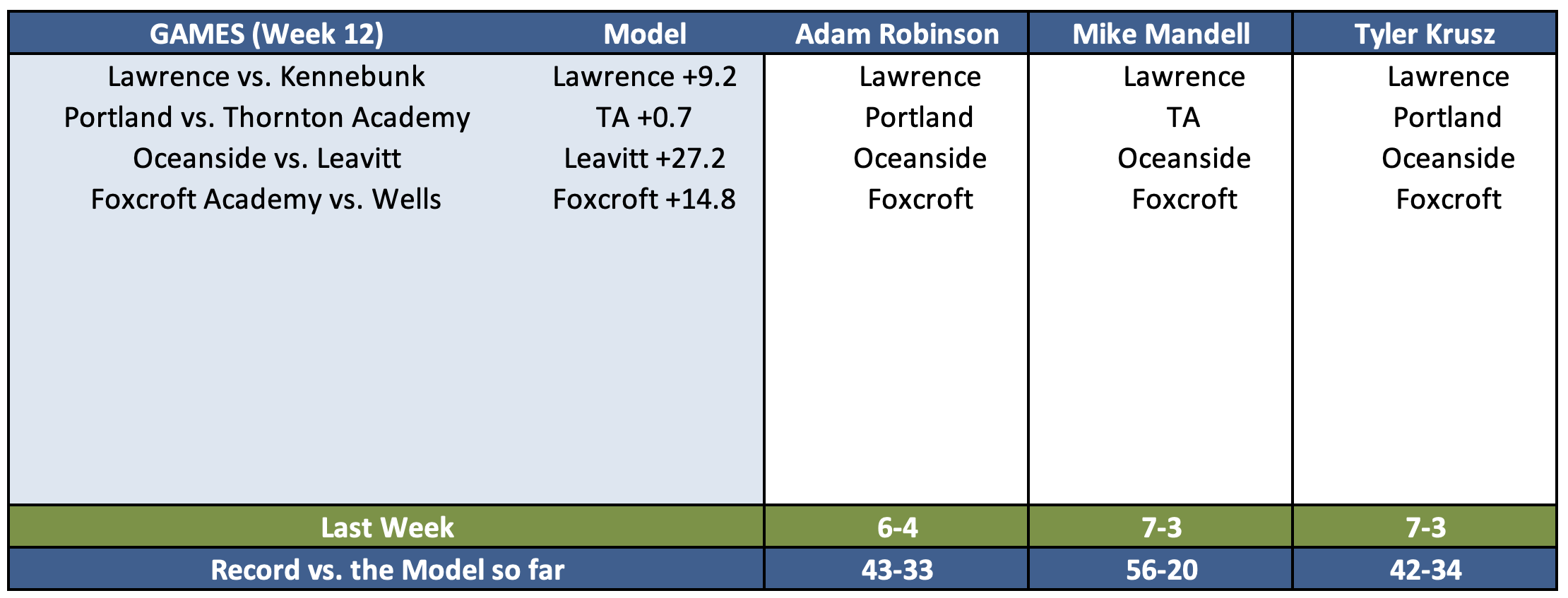 Here are their picks for Week 12.
