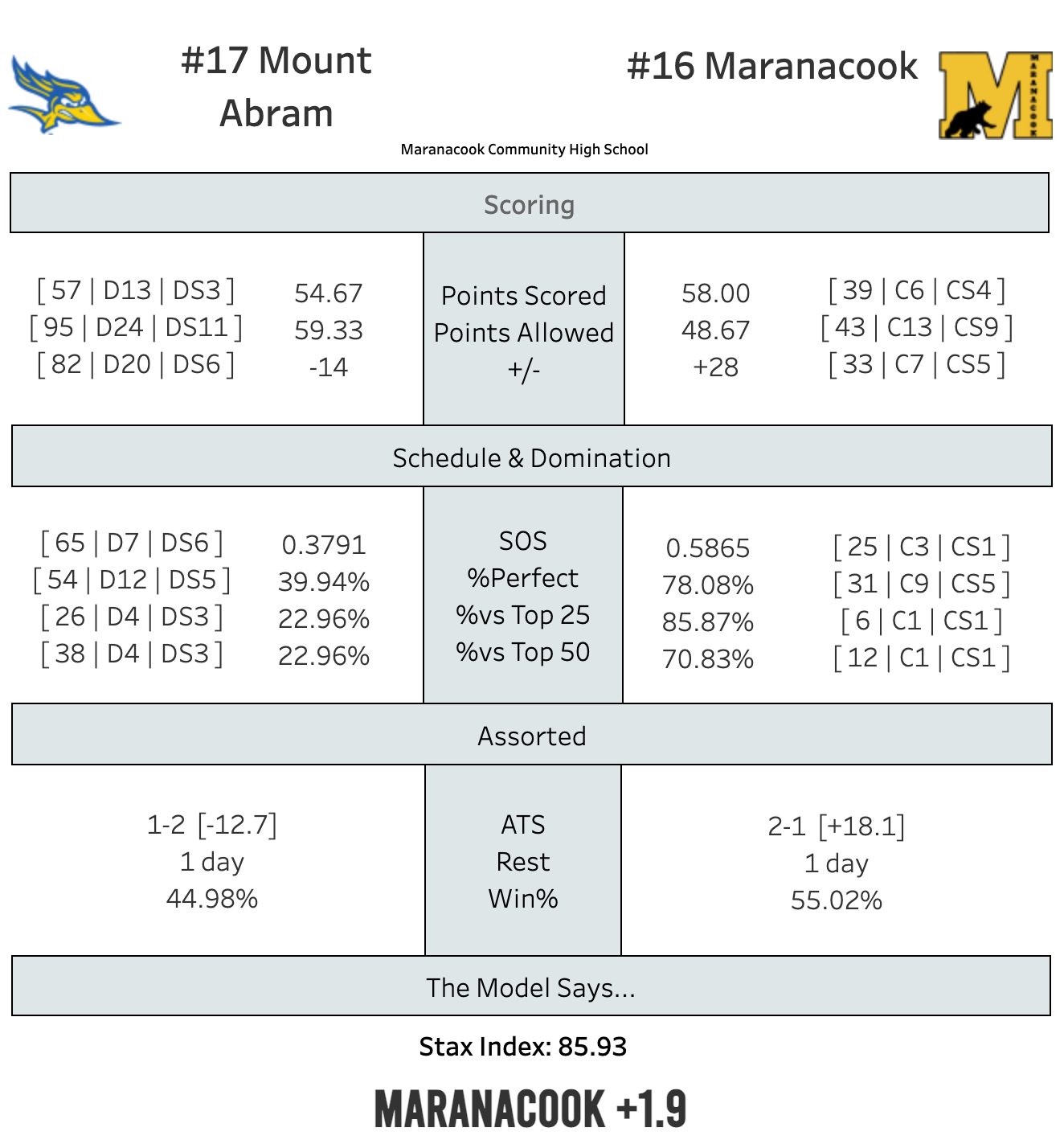 The Stax Index likes the GNG/Medomak girls and while I could make an argument for it, the fact is Medomak lost a lot in Kytana Williamson and I'm not confident the Model has caught up yet. I'm planning on being there to see for myself.