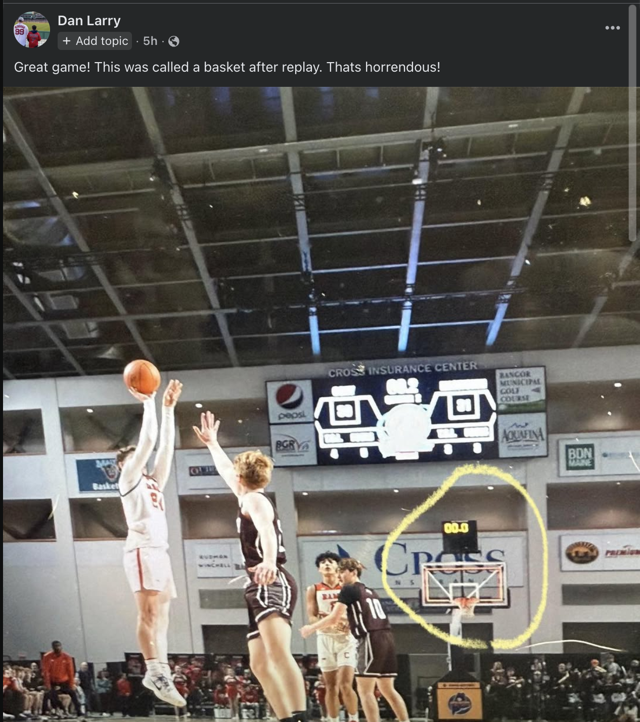 With time running out in the first half and #1 Cony trailing #5 Ellsworth by 1, Parker Morin's attempt at the buzzer was, well, see for yourself.