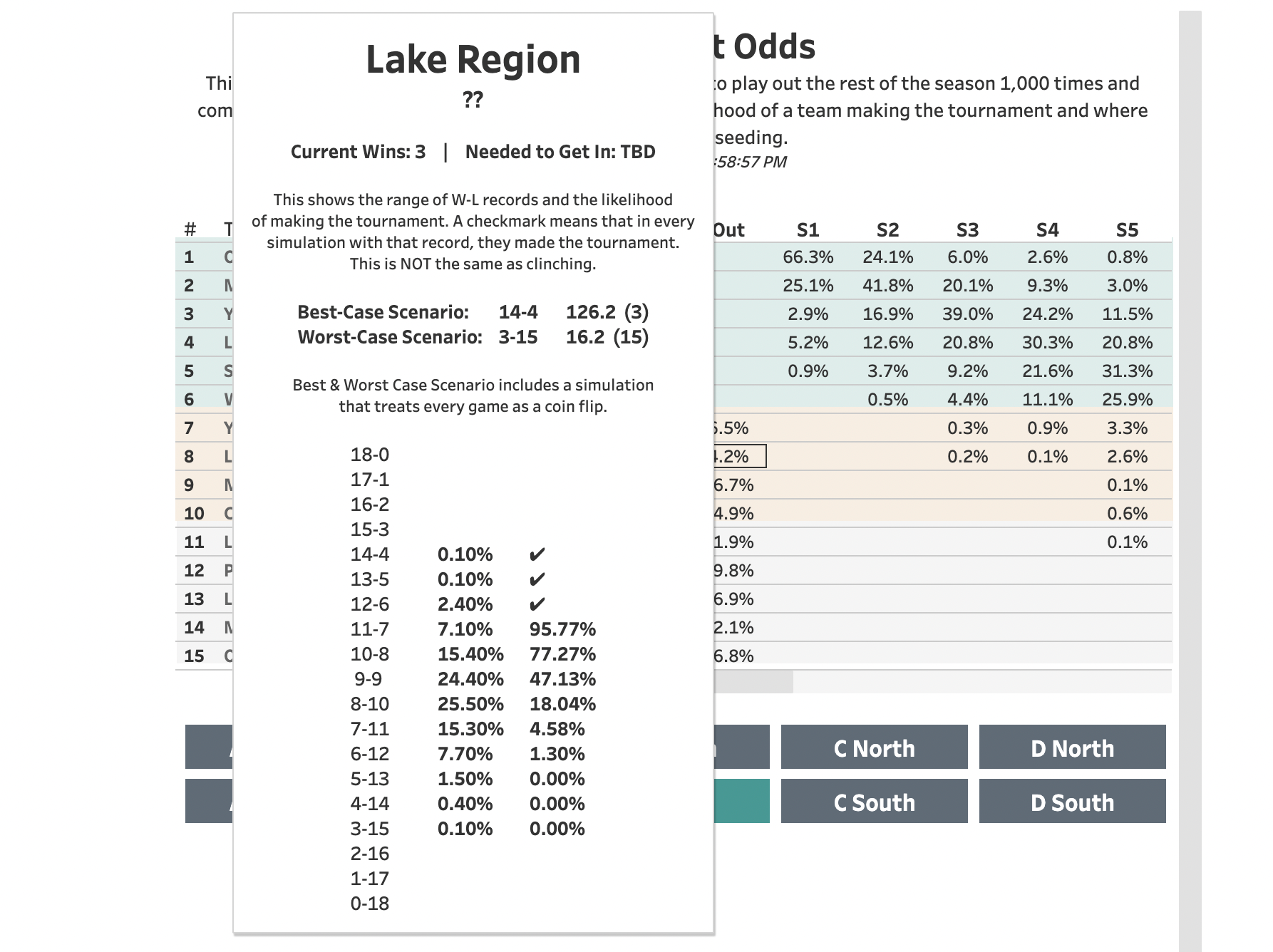 The Model makes projections for every game in the state and using a random number generator and a Monte Carlo Simulation--actually 130 Monte Carlo Simulations inside a large Monte Carlo Simulation--it simulates the rest of the season 1,000 times and calculates Heal Points standings for each of those 1,000 seasons.
