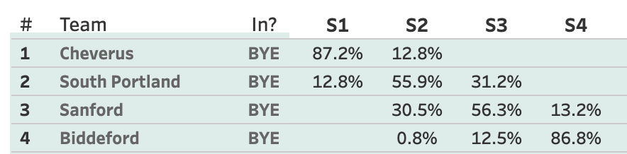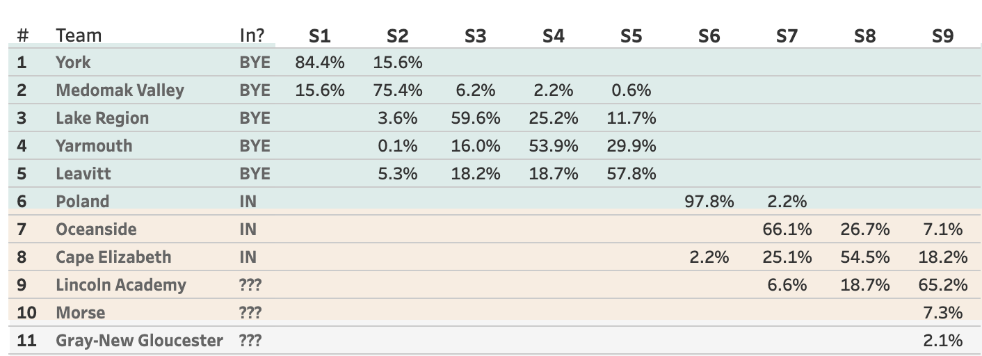 Lincoln Academy is at 99.7% to get in. I think we can call that one and kudos to a team I very much doubted in the pre-season after all the talent they graduated (and boy did I hear about that in Hannaford!). The final spot will come down to Morse and GNG. Morse has a slight lead, an extra game left, and more total Heal Points left on their schedule, so they're the favorites. GNG basically needs to win and hope for a Morse split.