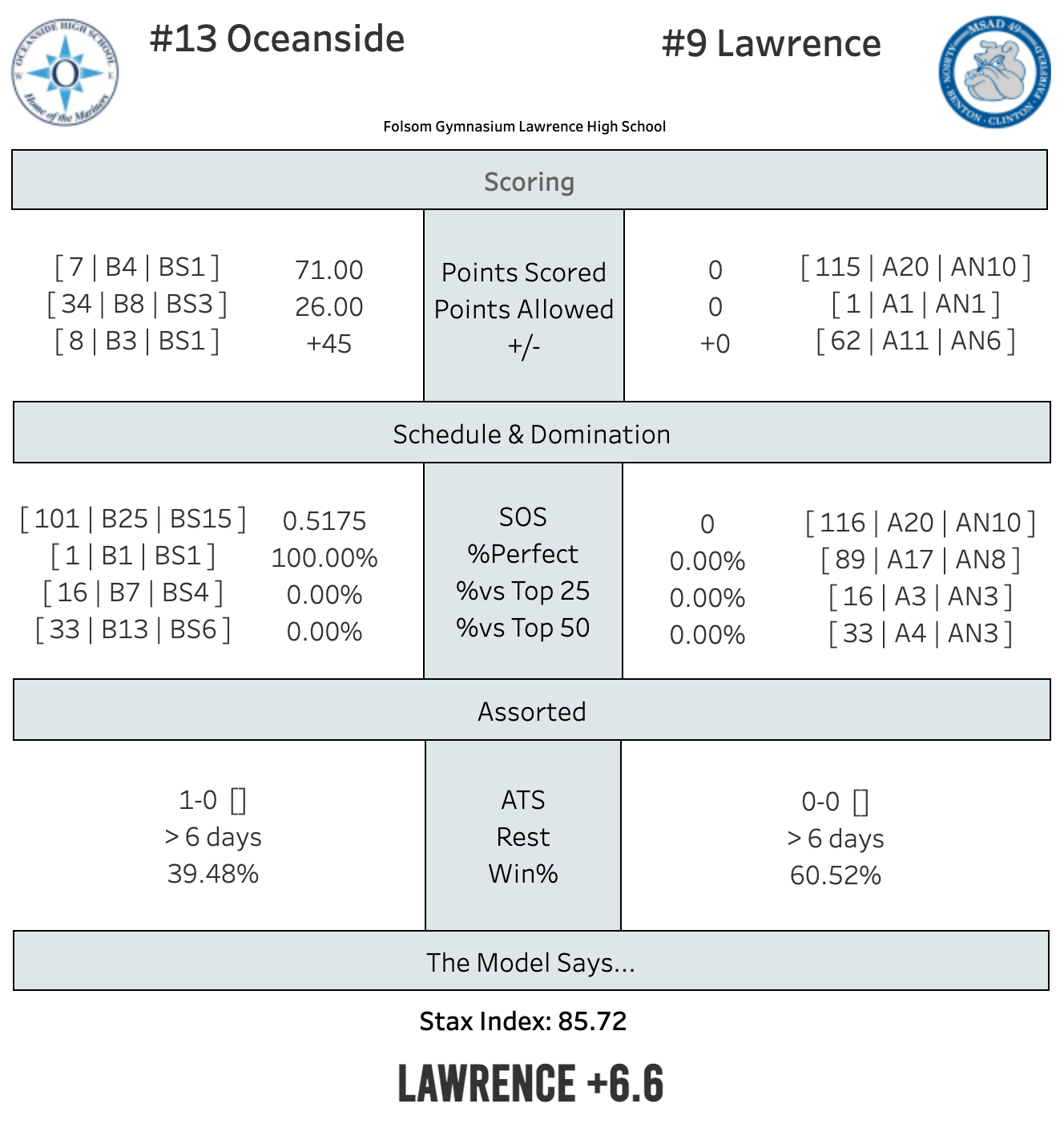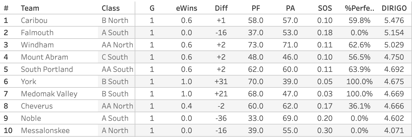 The Power Rankings are updated. There's the usual caveat here. The rankings start with last year's final rankings and go from there (hence, Falmouth being 2nd). It'll take a couple of games for this to work itself out. This football season, the Model was weird for 3 games and then locked in for week 4. That's roughly where basketball usually locks in, but it depends on who teams play and all that.