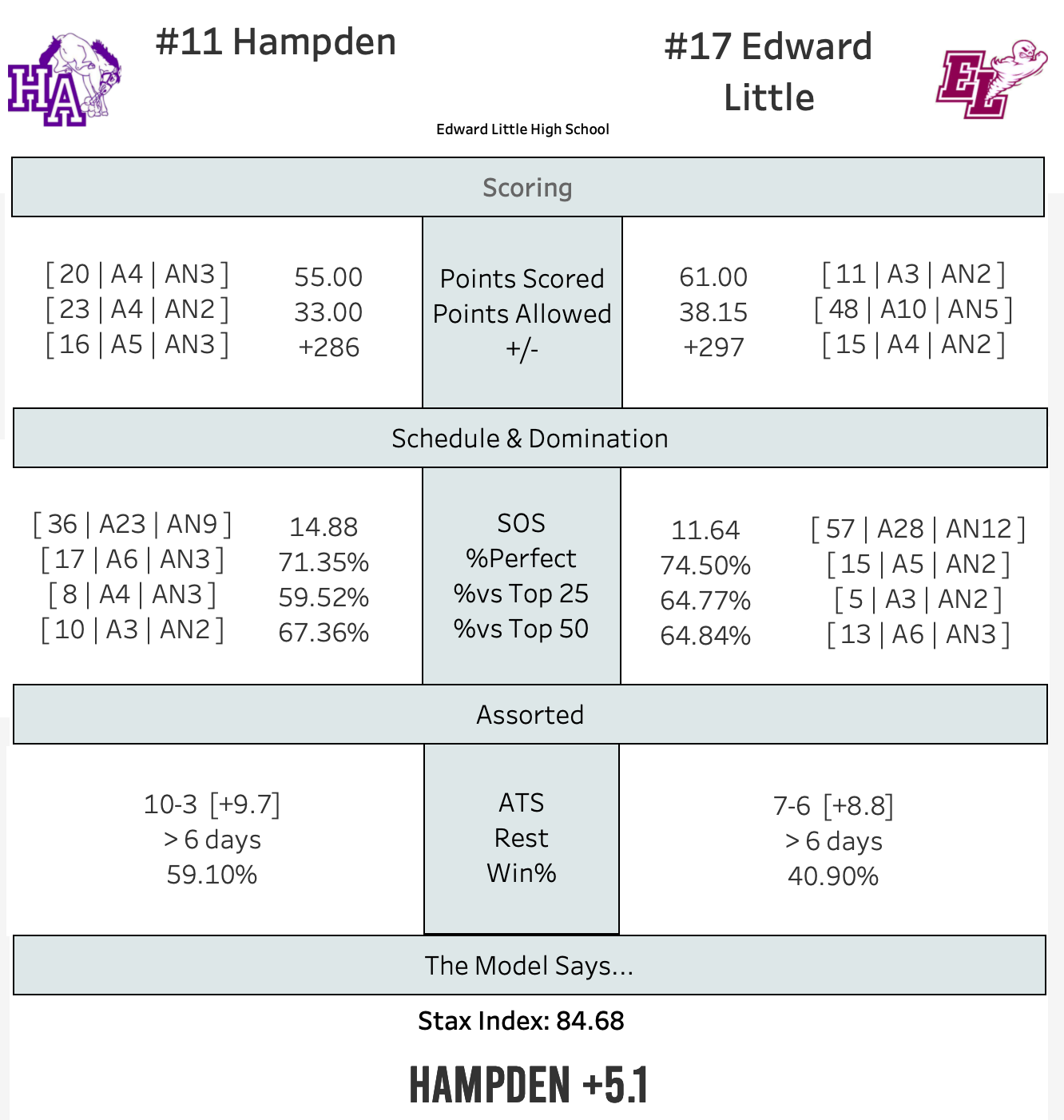 In the Game of the Day, Caribou outlasted Fort Kent 70-66. Tourney Odds are still running, but Caribou was 88% to get the 1 seed before the game and that'll almost certainly be a wrap. Fort Kent will either be the 2 or the 3.