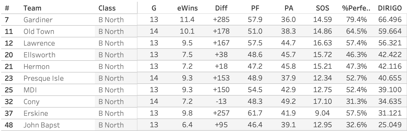 Only 9 of these teams are advancing to the postseason, so if the rankings hold, that means a top 50 team in the Power Rankings isn't making at least the play-in game. I used to write a thing every year about the best teams to not make the tourney, which seems to be lost to the archives of a previous version of this website, but Top 50 would be pretty rare. Last year, the highest ranked girls team to miss the tourney was Lake Region at #76 and that checks out. Something like 85 teams make it.