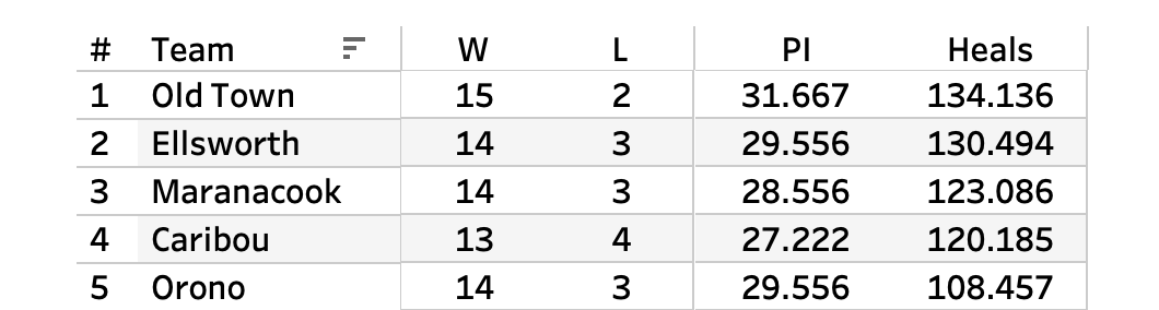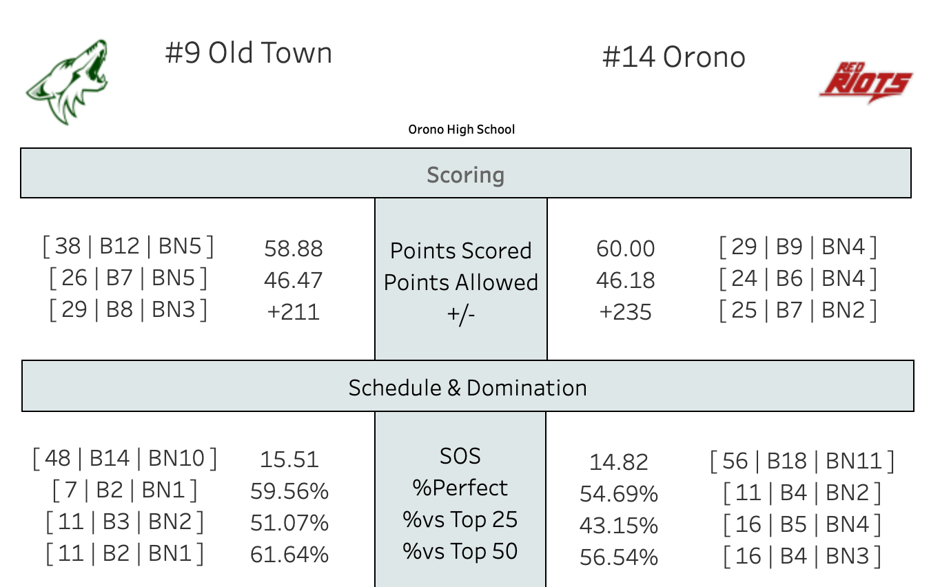 The Model's prediction was run with the assumption that Orono would be at home I'd forgotten about the move to the Pit (pre-tournament head cold). The original projection was Orono by 0.5. But on a neutral floor, it's Old Town by 1.5.