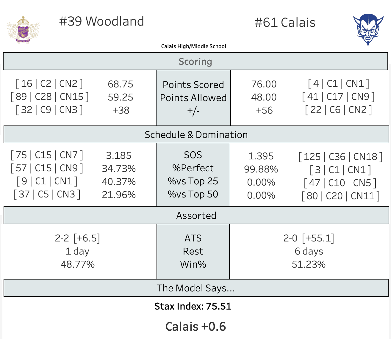 Woodland's much higher in the rankings, so you'd expect them to be favored in this one, but the Model adjusts for the fact that they have played twice as many games.