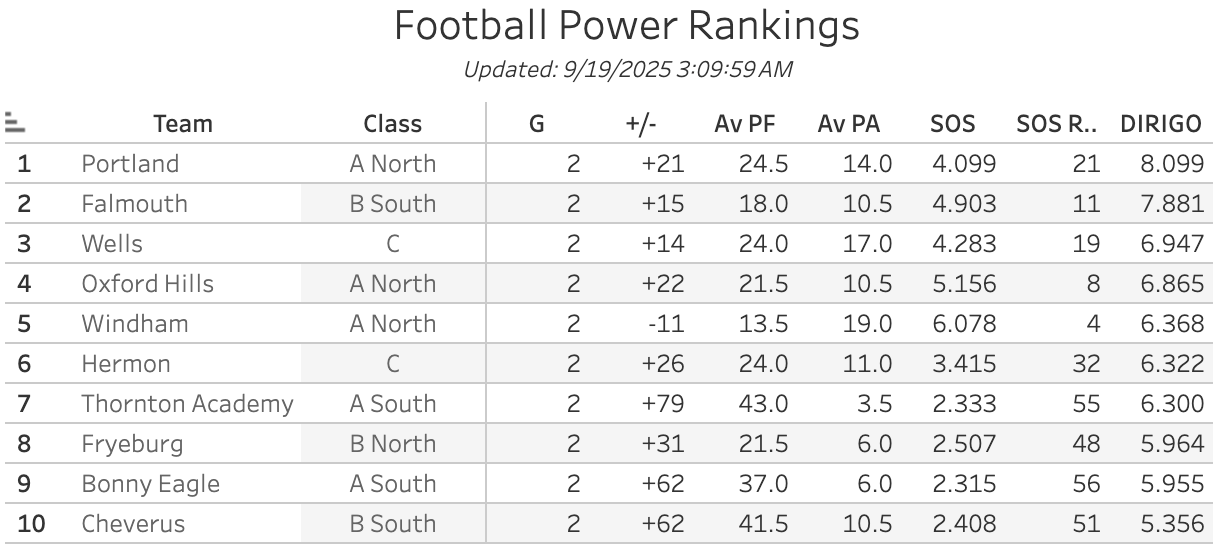 The Eagles will head to Standish for a battle with Bonny Eagle. The Scots are 2-0 and already +62 on the season. Why is Windham ranked higher? It's pretty simple. They're 4th in the state in Strength of Schedule through 2 games. Bonny Eagle is 56th. But they've got the 4th hardest remaining schedule. We're about to learn just how good they are.