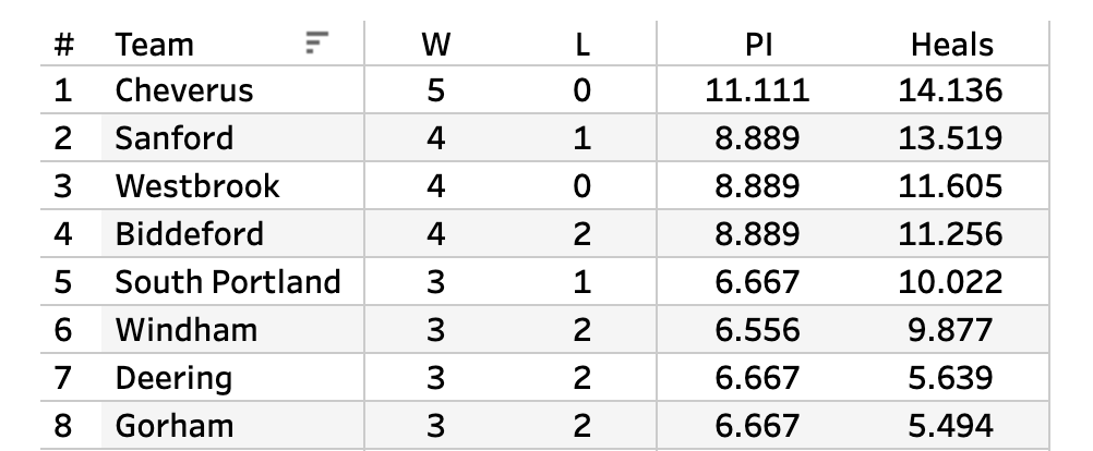 They'll head to Windham to take on the Eagles who are probably a bit of a surprise to be ranked as high as they are with a 3-2 record. They've got a close loss to Sanford on the road and gave Marshwood their only loss of the year--in a 62-26 blowout. They've got a good point differential against a tough schedule, thanks to the Marshwood win. Honestly I think they're probably too high. Something like #12 makes more sense because that might be an outlier. But if it isn't, they could be legit. And that would make A South even harder than we all thought.