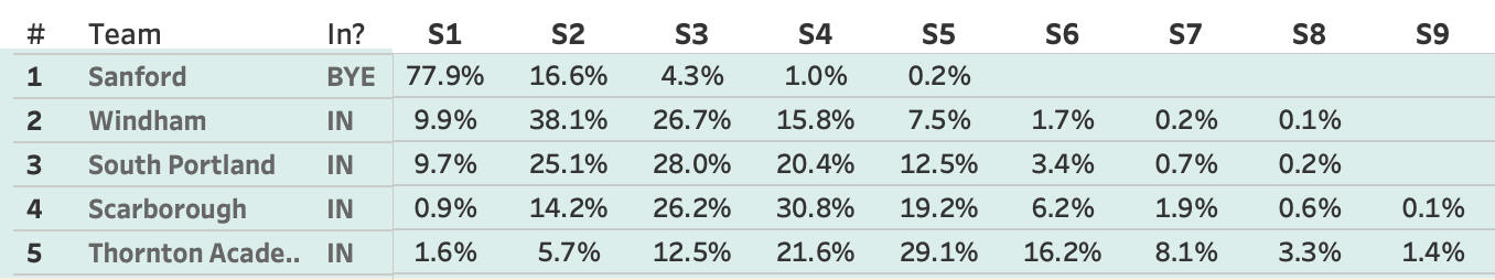 Two teams that don't need to worry about their playoff viability are Windham and Scarborough. Both teams project as in the playoffs, but there's a wide range of seeding possibilities. With 11 teams making the tourney, the top 5 will get a bye into the quarterfinals.