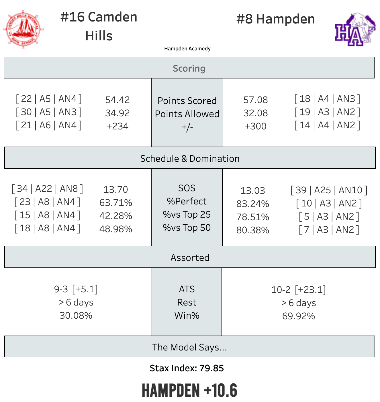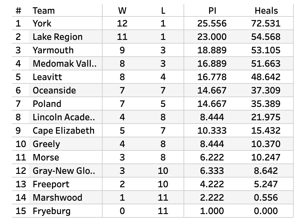 But lurking is Camden at 10-2, with losses to Oceanside and Edward Little. Oh, and that 1 Hampden loss? It was to Camden. Can the Windjammers pull off the sweep and really turn the top 4 seeds into a free-for-all? Or will the Broncos further extend their lead for the 1 seed?