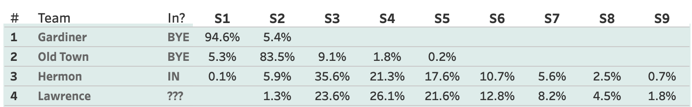 On each line, this tells you the range of seeds your team can get if they win a certain number of games and the likelihood of making the tournament. So for Winslow, 9 wins almost certainly gets them in the Tournament (97.1%) and they get the 7 seed in 13.2% of simulations.