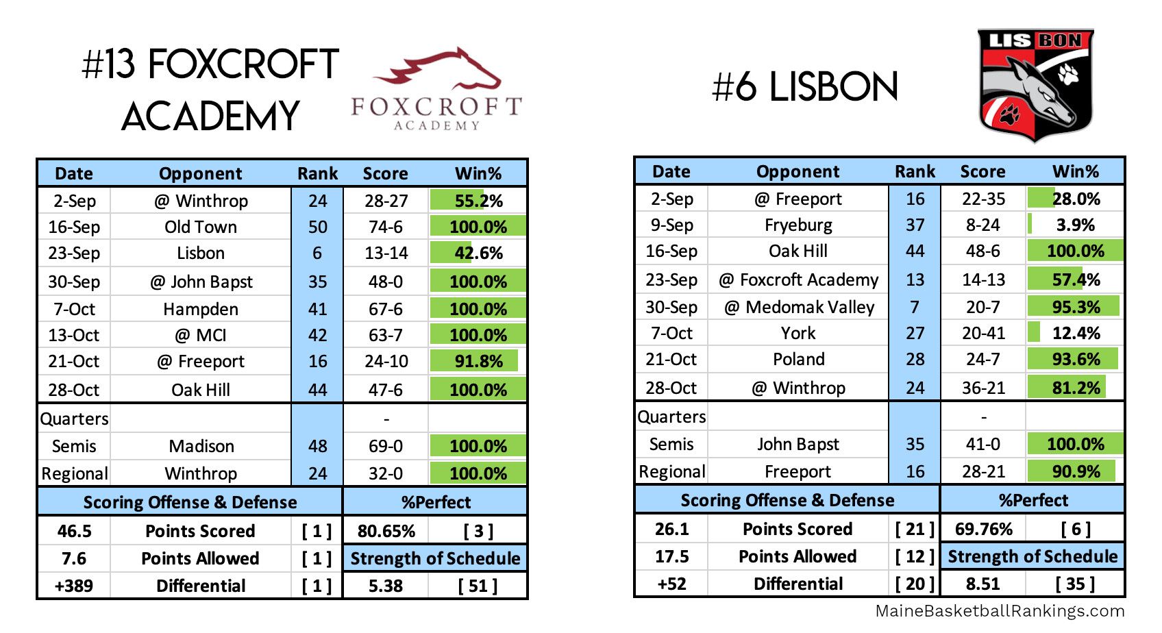 As for Lisbon...I don't know what's going on there. They got blown out by #37 Fryeburg, then beat Foxcroft and Medomak back-to-back on the road. But then they lost at home to a York team that was outscored by nearly 10 points a game. So which Lisbon team will show up? This could be a Foxcroft blowout, a Lisbon blowout, or come down to the final play and none of them would surprise me.