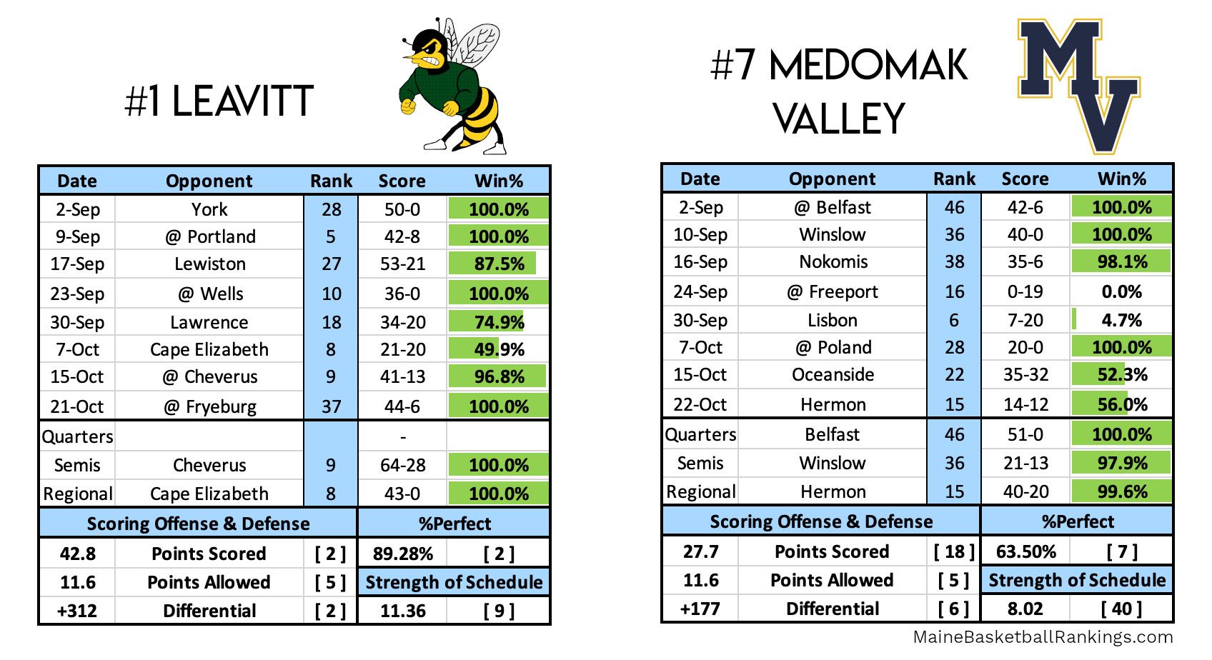 Leavitt is clearly a juggernaut. They had one close game against Cape Elizabeth and everything else has been a blowout, including the Regional Final against Cape Elizabeth. And not just blowouts, but blowouts against a daunting schedule. It's not hard to see why they're the favorites.
