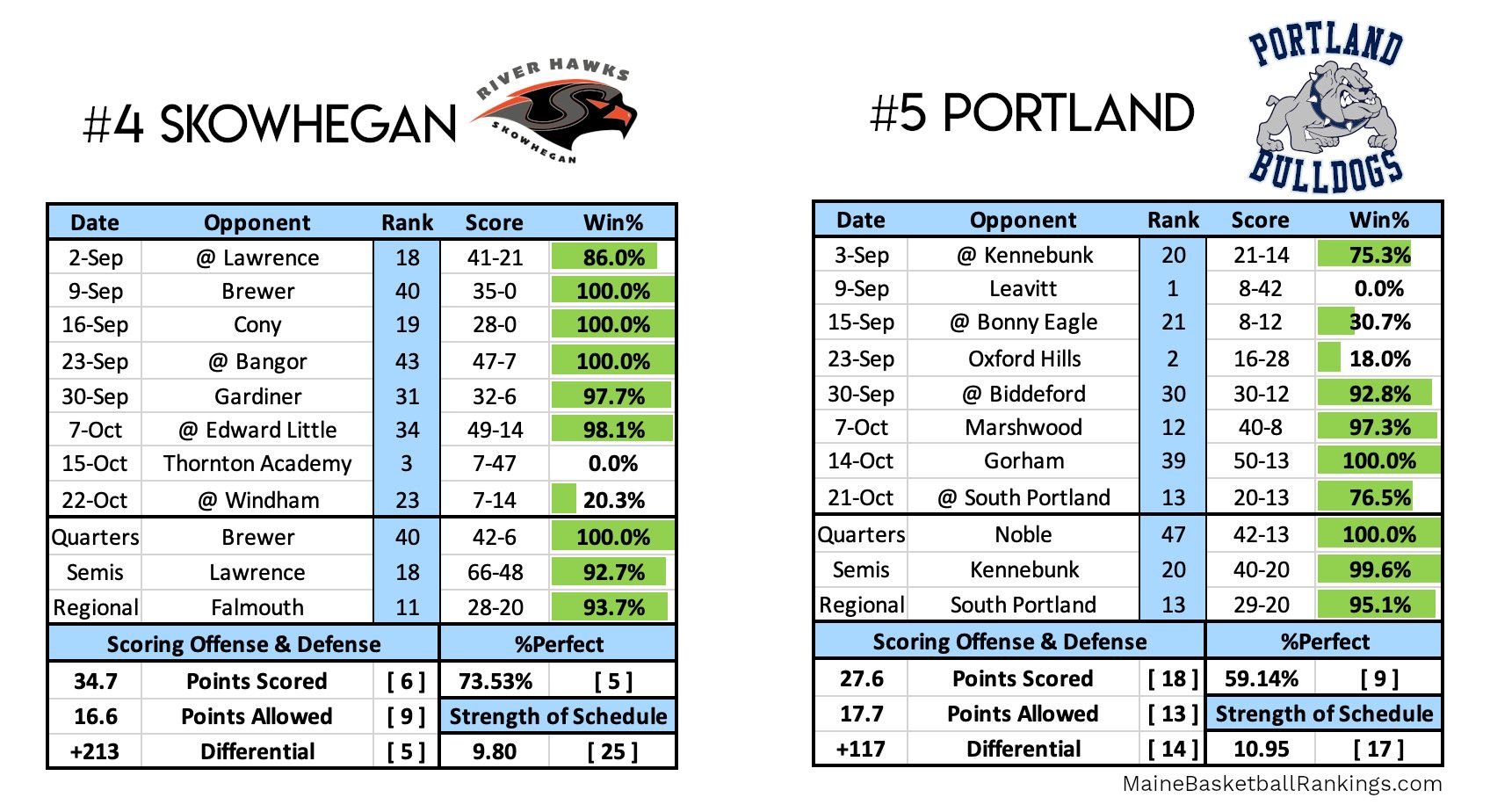 If you take Skowhegan's game against Thornton Academy out of the equation, they look unbeatable. But it's worth noting that was their only game against a team in the top 10. In basketball, this is usually a red flag, but the shorter season and smaller sample size has to be taken into consideration. Couple it with the fact that in the 7 games against teams outside the Top 20, the River Hawks gave up 5.7 points per game. But against teams inside the Top 20? That number jumps to 34.