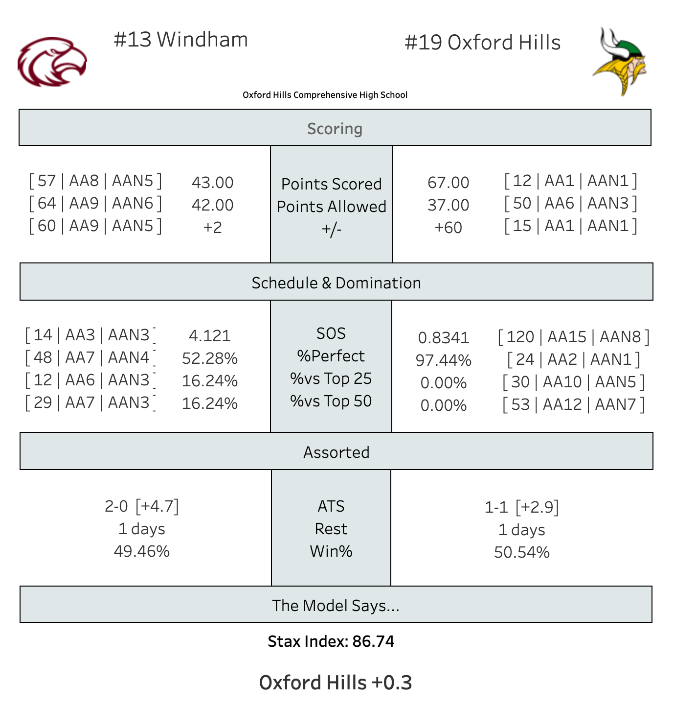 Windham is a young team and no longer features Sarah Talon. The Model is starting to learn that (although they are 2-0 against the spread). I'm pretty confident the Model is too low on Oxford Hills, so let's just say I'm glad the pick landed where it did.