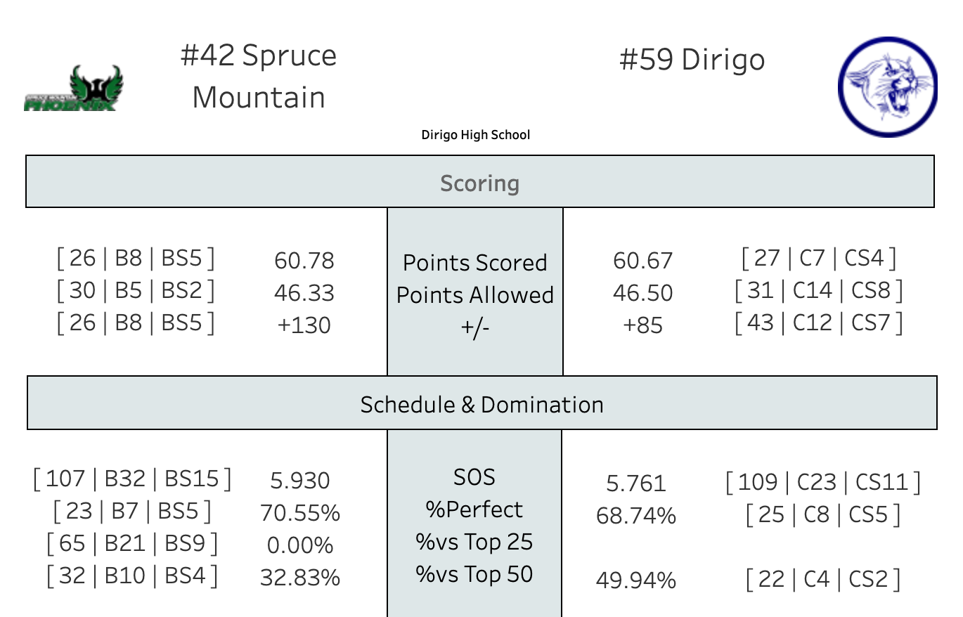 Coming into last night's action, Dirigo had a wide spread in the Tourney Odds. They could still get the 1 seed, but they could also fall all the way down to 13. More likely, they look to be in the mix for the final bye, so Heal Points will be at a premium. One of the best opportunities on their remaining schedule is Spruce Mountain.