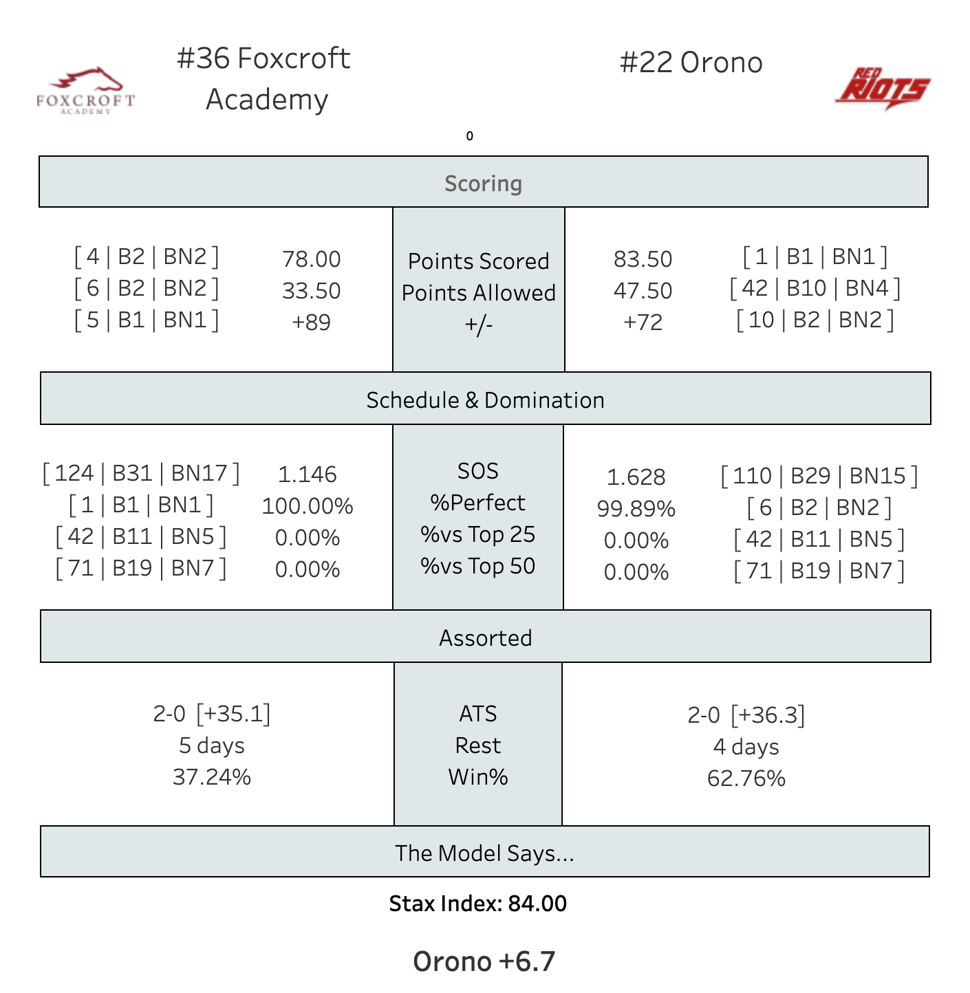Speaking of high-scoring games, there should be plenty of that on display in Orono. The Red Riots, fueled by a breakout game from freshman Brady Hews, boast the highest-scoring offense in the state at 83.5 points a game.