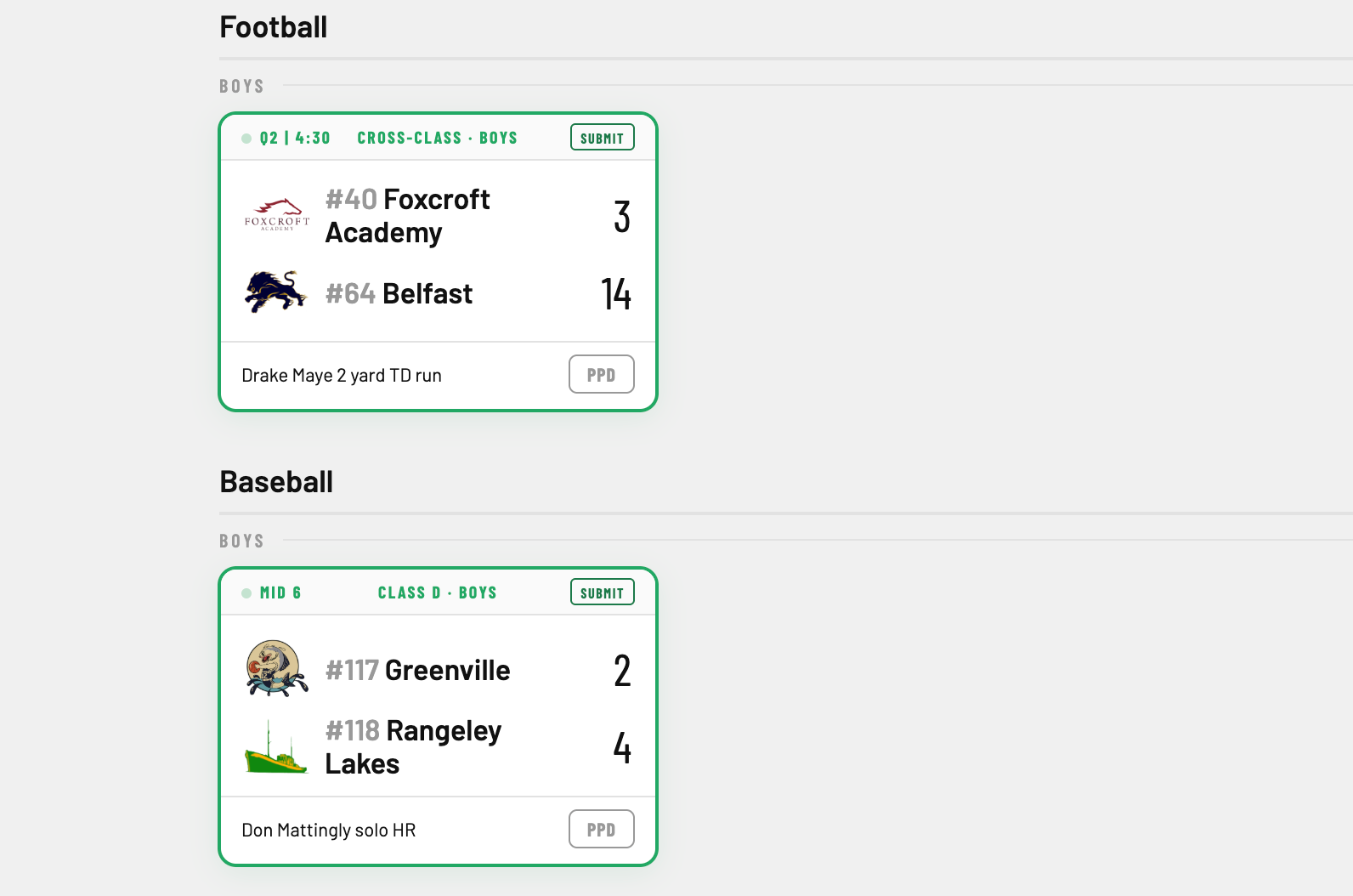 Each of the day's games has a submit button (these are dummy games) where you can submit a final score or a score of a game in-progress. Maybe a halftime score or maybe for football season an update after each touchdown. People can do whatever. For each sport, it'll have a slightly different input (baseball has innings instead of quarters) and you can put notable stuff in there, like who scored more recently. This will be great for scoreboard watching late.