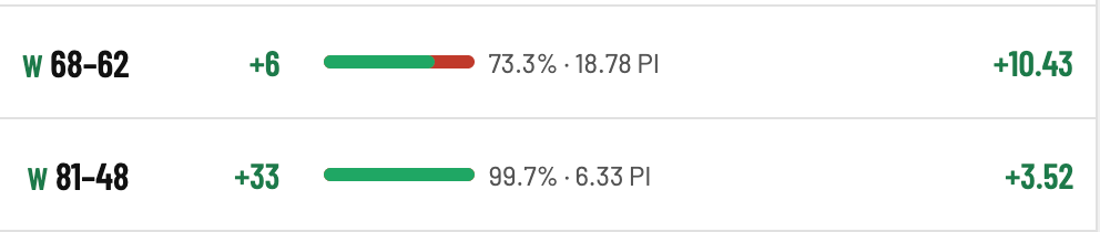 The green bar is the Win% that you might recognize from the Tourney Guide. It'll show you how strong (or weak) a team's performance was in a given game.