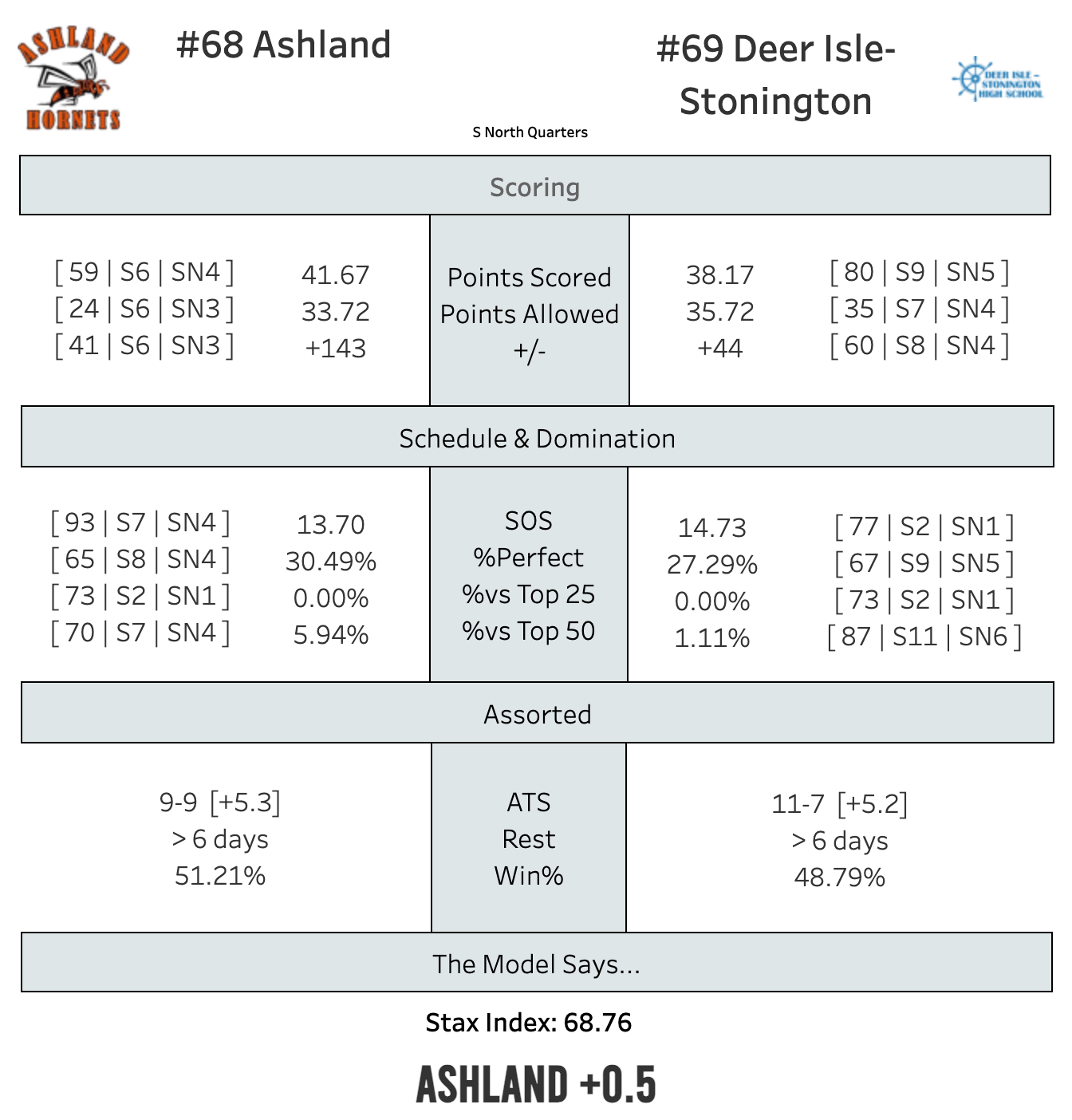 Ashland and Deer Isle-Stonington didn't play in the regular season (that'd be a 3 hour and 43 minute drive each way, in case you're wondering). Unless I'm missing something, they only had one opponent in common--East Grand--and they both handled them easily.