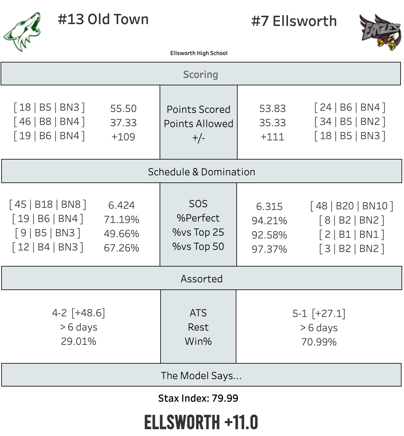 I think the Old Town loss to a Hermon team that Ellsworth beat tells us a lot here, but I'm not sure I buy the Model's spread of 11. We'll see!