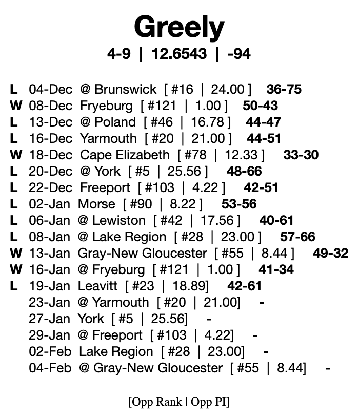 Since failing to qualify for the Western Class B playoffs in 1991, Greely has appeared in 33 consecutive regional tournaments. Yet at 4-9, the 11th-place Rangers are below the line in Class B South, with Maine Basketball Rankings giving them roughly 1-in-6 odds (17.0 percent) to qualify.