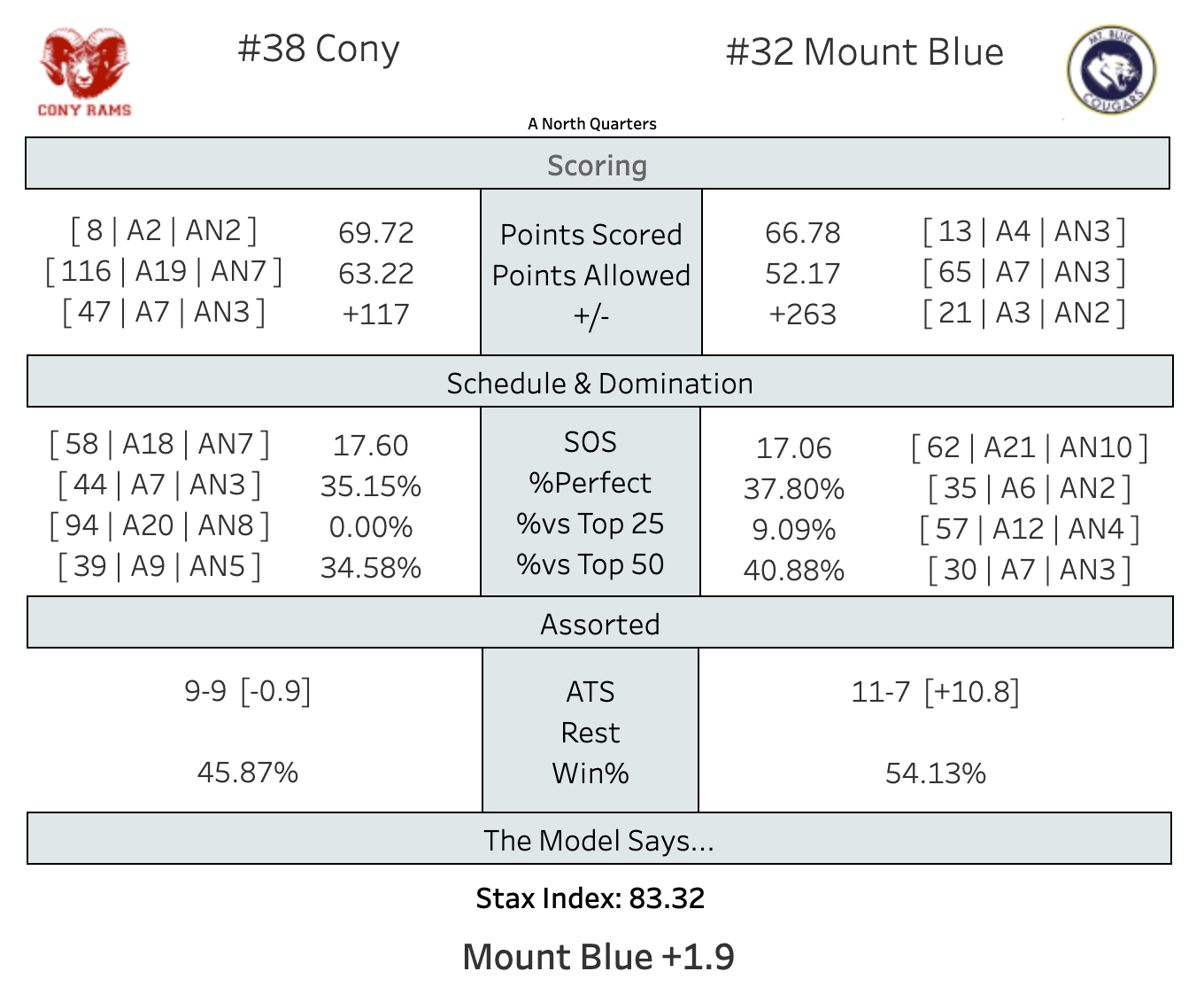 Mount Blue is led by Evans Sterling (17.6 PPG) and Chandler Briggs (13.3 PPG). They're a high-scoring team, with the 2nd best point differential in A North behind Brewer and were the first team to put a scare in the Witches.