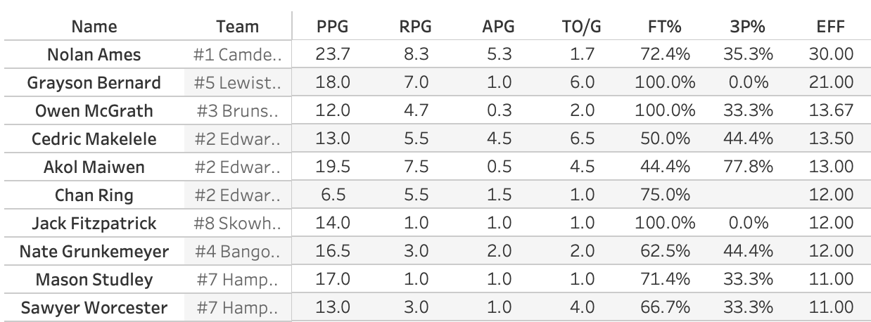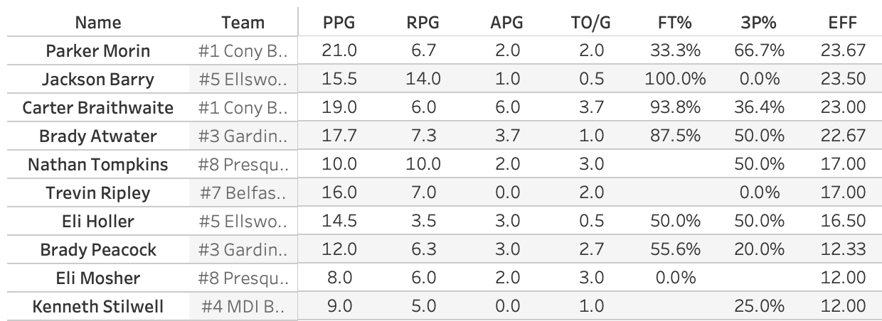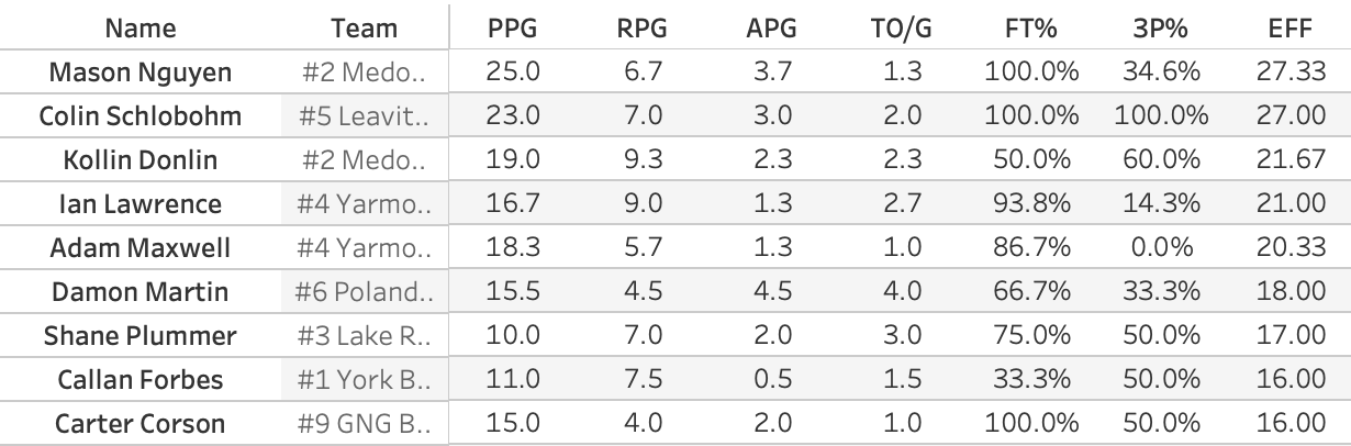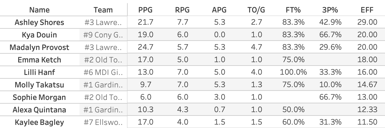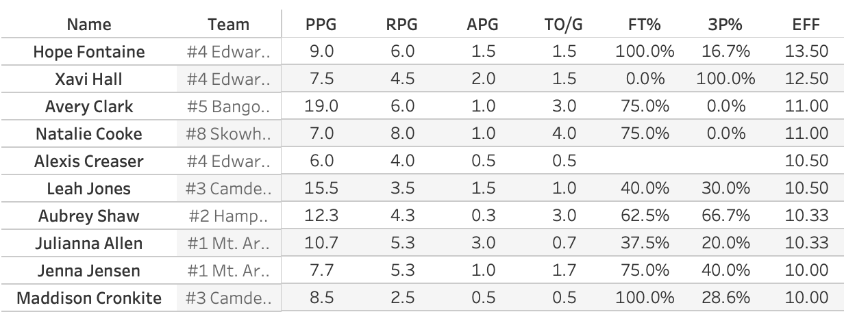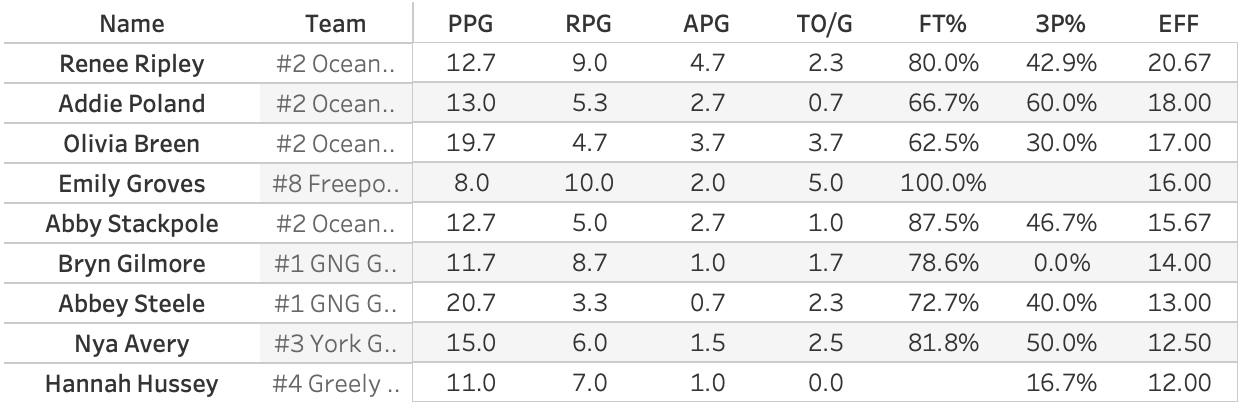 So, naturally, the MVP of the tournament went to GNG's Abbey Steele who poured in 33 points in the losing effort. Not to denigrate Steele, who I'm sure would much rather have won the game, but huh? You'll sometimes see a MVP coming from the losing team. You know how it goes. One person puts up huge numbers to drag their team to the last game and the winning team has a balanced box score. So let's look at the Efficiency leaders for the regional. EFF isn't a perfect stat, but it's a good all-in-one stat.