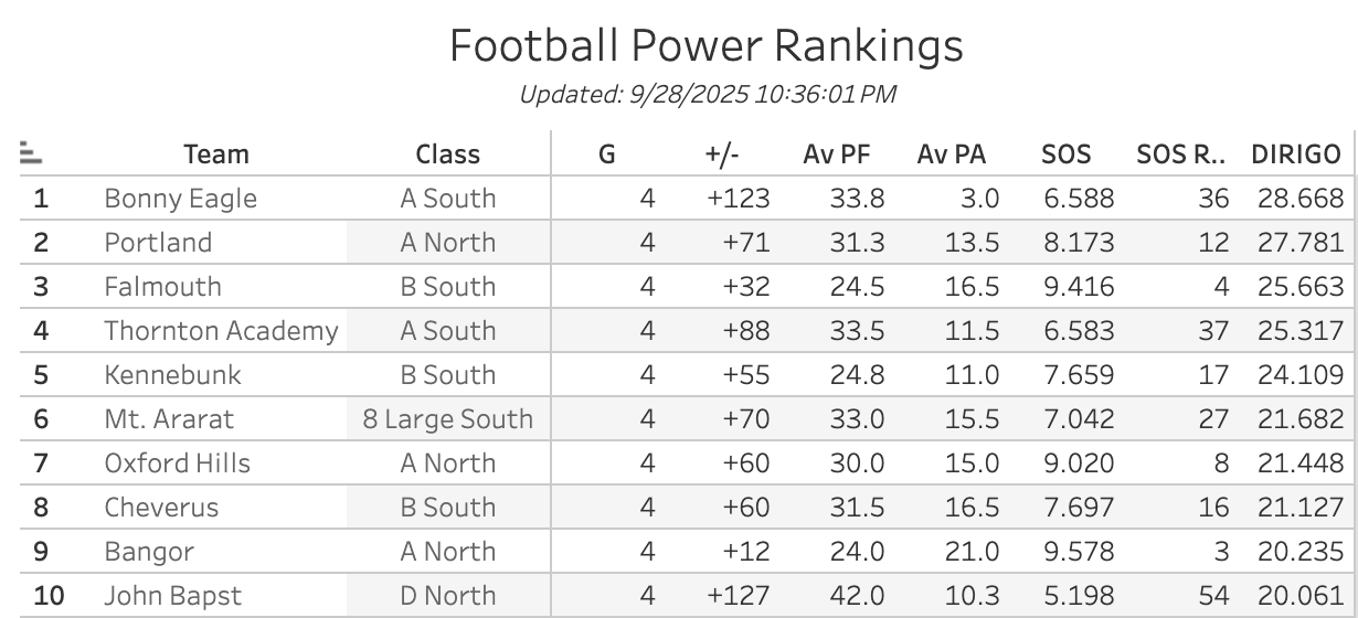 The football rankings are updated and they're starting to round into shape. The big surprise is Bonny Eagle rising to number 1. They're only giving up 3 points a game, which is a surefire way to win ballgames.