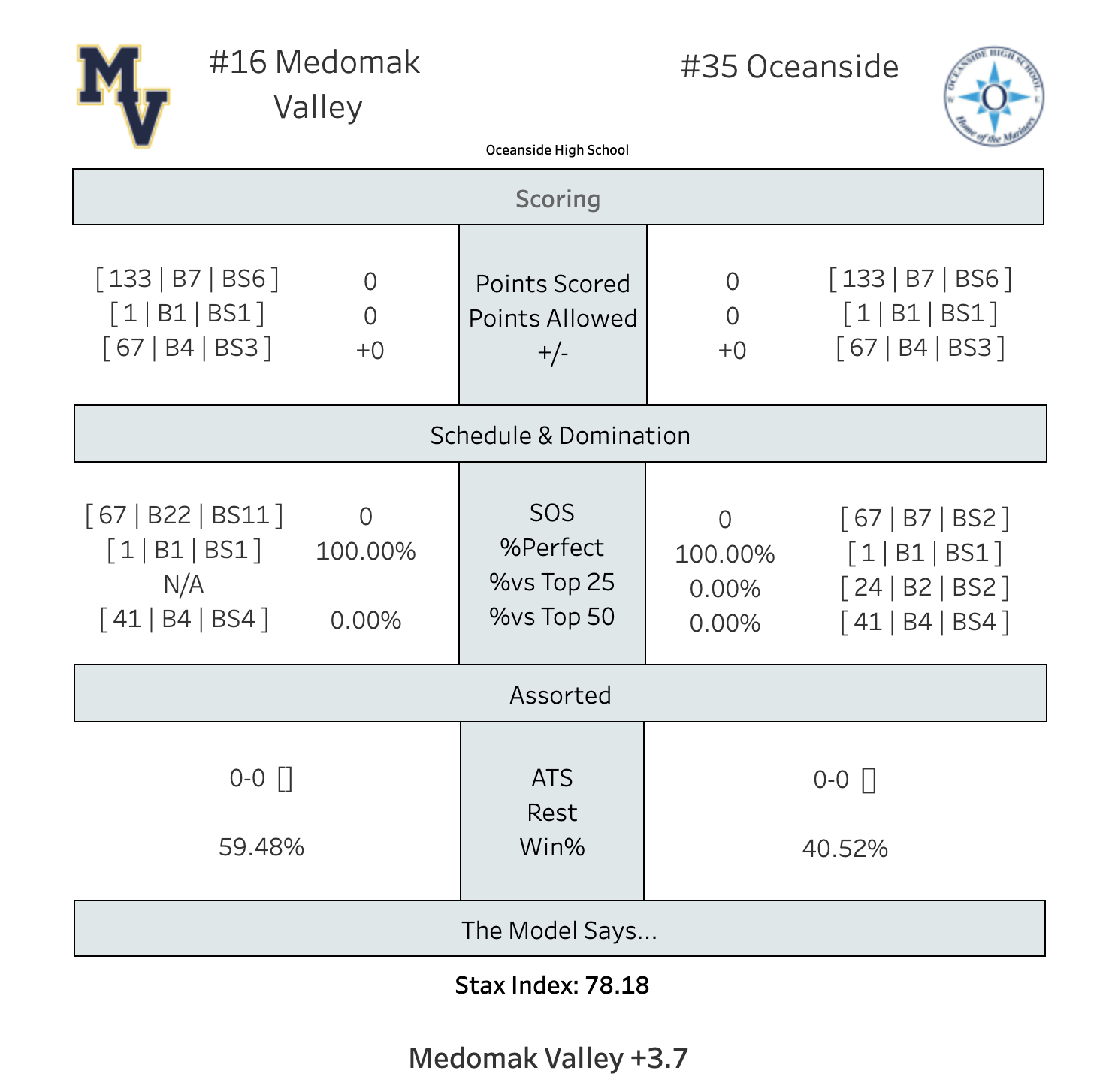 The Stax Index has dialed up another great game for you tonight, a rivalry tilt as Medomak Valley heads north on Route 1 to face Oceanside. The Panthers were the B South runners up last season, but they've graduated their entire starting 5, including 1,000 point scorer Trevor Brown. The Model doesn't know this, of course. But you can be confident that Medomak will reload--they always do. You can also be sure that Oceanside will be hyped up for the matchup--they always are.