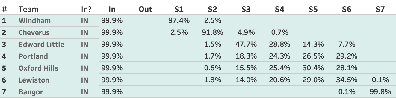The Spruce Mountain boys are the probably 3 seed in B South--they're 86.6% in the Tourney Odds to finish there, so there's a chance Lincoln Academy could get there. But, you have to think they want a shot at revenge against York in semifinals after last year's controversial quarterfinal loss.