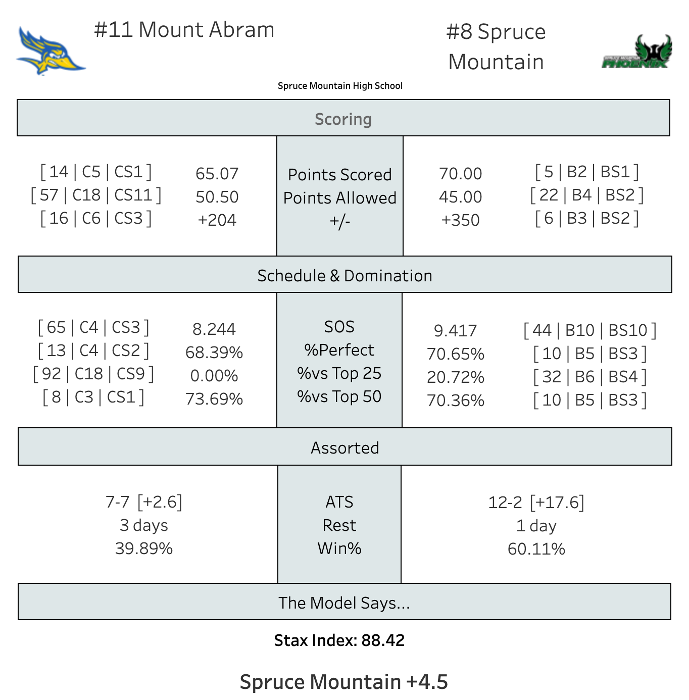 What this game lacks in playoff implications, it has in scoring. Mount Abram is 14th in the state in scoring and Spruce is 5th, so this should be a lot of fun.