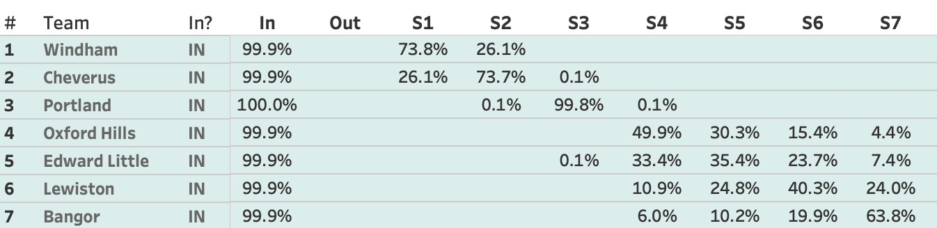 Even with the loss to Gorham, Windham controls their destiny for the 1 seed. Portland has locked up the 3. It's rare to see a team this locked this early. But it's not unprecedented. One year, the Greely girls (Anna DeWolfe version) were at 100% for the 1 seed on January 1st. (Spoiler: they were the 1 seed)