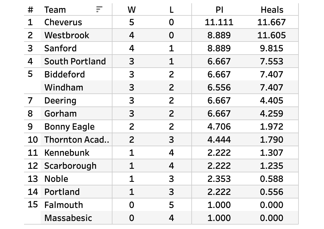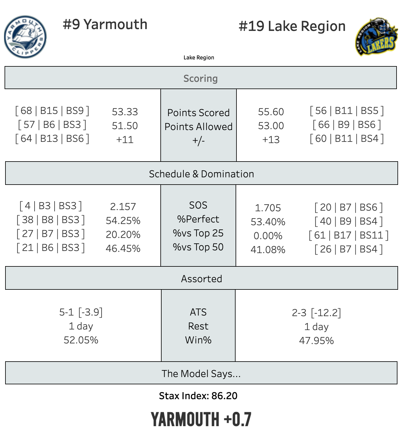 Lake Region lost to York 70-39 on Opening Day. And sure, it's York, but that's a big point differential even by York's standards. The only bigger one was against winless Fryeburg. Since then, they've quietly won 4 straight and find themselves in third place in B South at 4-1, but they're only +13 (because of that blowout loss).
