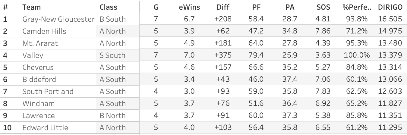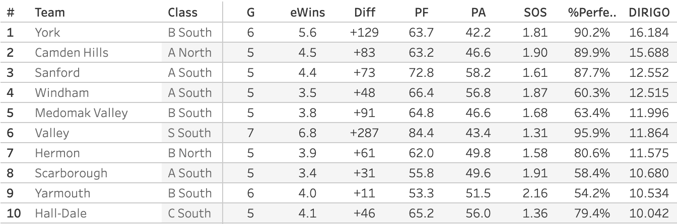 So we're a couple of games into the season, so the Rankings have had a chance to sort themselves out. The York boys ascend to the top spot of the boys rankings, supplanting a Camden team that had the audacity to reschedule their game on Friday. Sanford moves to third with a big win over Scarborough. Windham is 4th after beating Portland. Medomak is 5th. Valley is 6th, partly because they've outscored opponents by 41 points a game and partly because they've played 7 games already.