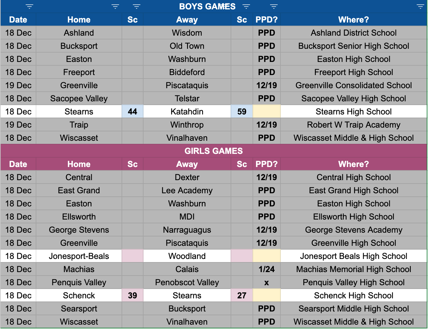 We got 2 games last night, as best I can tell. The Katahdin boys beat Stearns 59-44 and the Schenck girls beat Stearns 39-27.